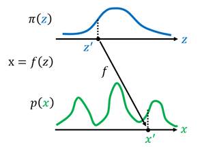 至此,我们得到了一个比较重要的结论:如果z与x分别满足两种分布,并且z通过函数f能够转变为x,那么z与x中的任意一组对应采样点