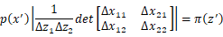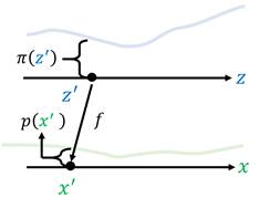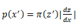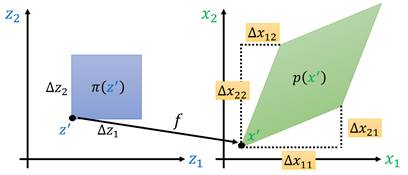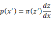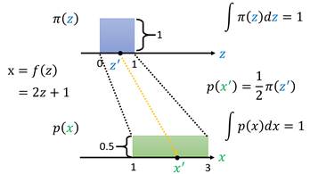 如上图所示,假设在[𝑧′,𝑧′+∆𝑧]上π(z)近似服从均匀分布,在[x′,x′+∆x]上p(x)也近似服从均匀分布,于是有𝑝(𝑥′ )∆𝑥=𝜋(𝑧′ )∆𝑧(因为变换前后的面积/即采样概率是一致的),当∆x与∆𝑧极小时,有: