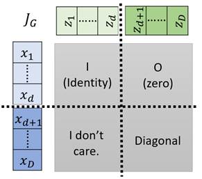 所以Jacobian矩阵的左上角区域是单位矩阵I,然后