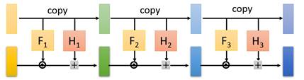 如上图所示,z和x都会被拆分成两个部分,分别是前1~d维和后d+1~D维。从z变化为x的计算式为:z的1~d维直接复制(copy)给x的1~d维;z的d+1~D维分别通过F和H两个函数变换为