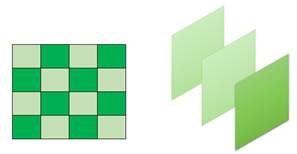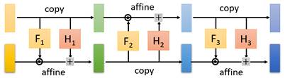 上图展示了两种按照不同的数据划分方式做copy与affine的交替变换。左图代表的是在像素维度上做划分,即将横纵坐标之和为偶数的划分为一类,和为奇数的划分为另外一类,然后两类分别交替做copy和affine变换(两两交替);右图代表的是在通道维度上做划分,通常图像会有三通道,那么在每一次耦合变换中按顺序选择一个通道做copy,其他通道做affine(三个轮换交替),从而最终变换出我们需要的生成图形出来。